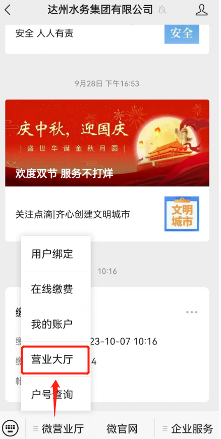 首先進(jìn)入達(dá)州水務(wù)集團(tuán)有限公司微信公眾號,點(diǎn)擊微營業(yè)廳-營業(yè)大廳,進(jìn)入營業(yè)大廳界面。