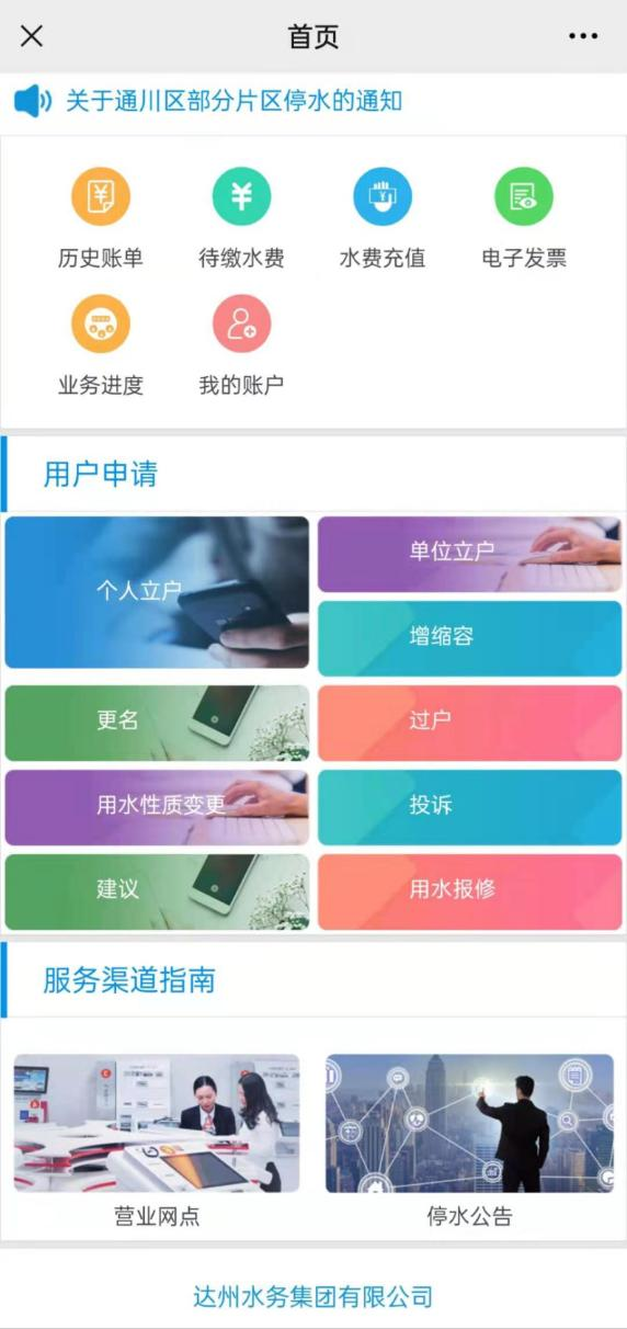 關(guān)注“達(dá)州水務(wù)集團(tuán)有限公司”公眾號,點擊“微營業(yè)廳”中的“營業(yè)大廳”。