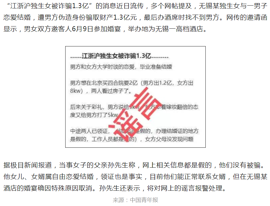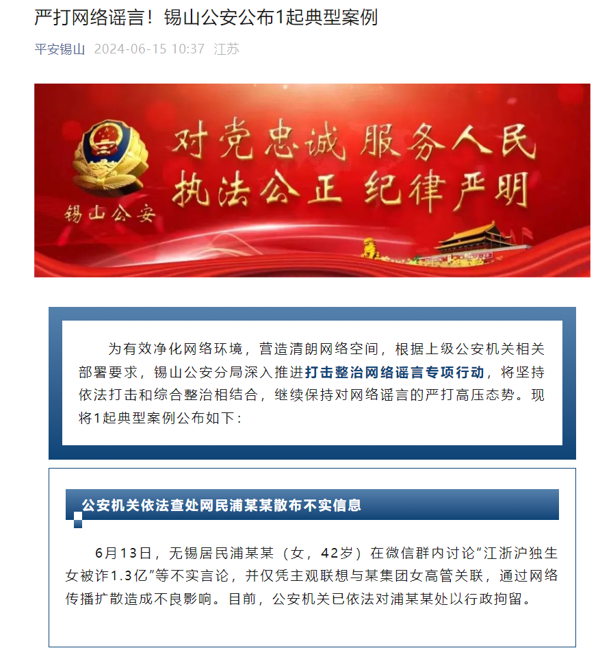 6月15日,江蘇無錫市公安局錫山分局發(fā)布通報稱,無錫居民浦某某(女,42歲)13日在微信群內(nèi)討論“江浙滬獨生女被詐1.3億”等不實言論,并僅憑主觀聯(lián)想,與某集團(tuán)女高管關(guān)聯(lián),通過網(wǎng)絡(luò)傳播擴散造成不良影響。目前,公安機關(guān)已依法對浦某某處以行政拘留。