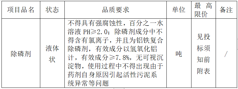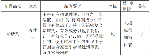 注:(1)數(shù)量為暫定1000噸,根據(jù)實際發(fā)生據(jù)實結(jié)算。在除磷劑使用期間,在合理規(guī)定的使用情況下,使用效果達(dá)不到要求造成我公司遭受的一切損失(包含環(huán)保處罰)由乙方全部承擔(dān)。處理成本價格每噸水0.06元,并保證出水水質(zhì)達(dá)標(biāo),超出處理成本價格由中標(biāo)方負(fù)責(zé)承擔(dān),使用單位有權(quán)直接從貨款扣除超出成本多余金額。