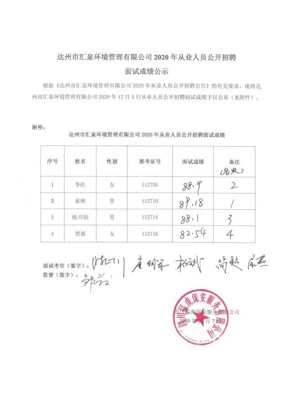標(biāo)題:達(dá)州市匯泉環(huán)境管理有限公司2020年從業(yè)人員公開招聘面試成績(jī)公示