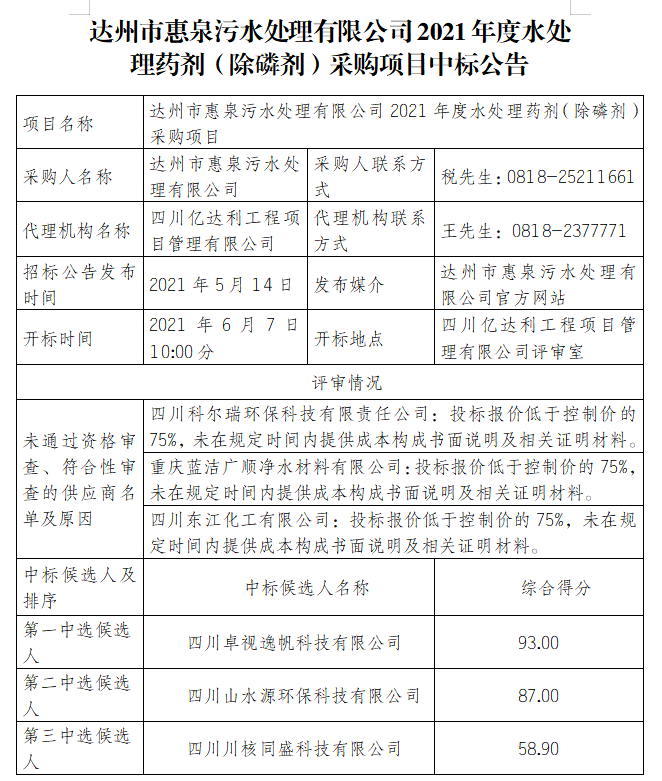 標(biāo)題:達(dá)州市惠泉污水處理有限公司2021年度水處理藥劑(除磷劑)采購項(xiàng)目中標(biāo)公告